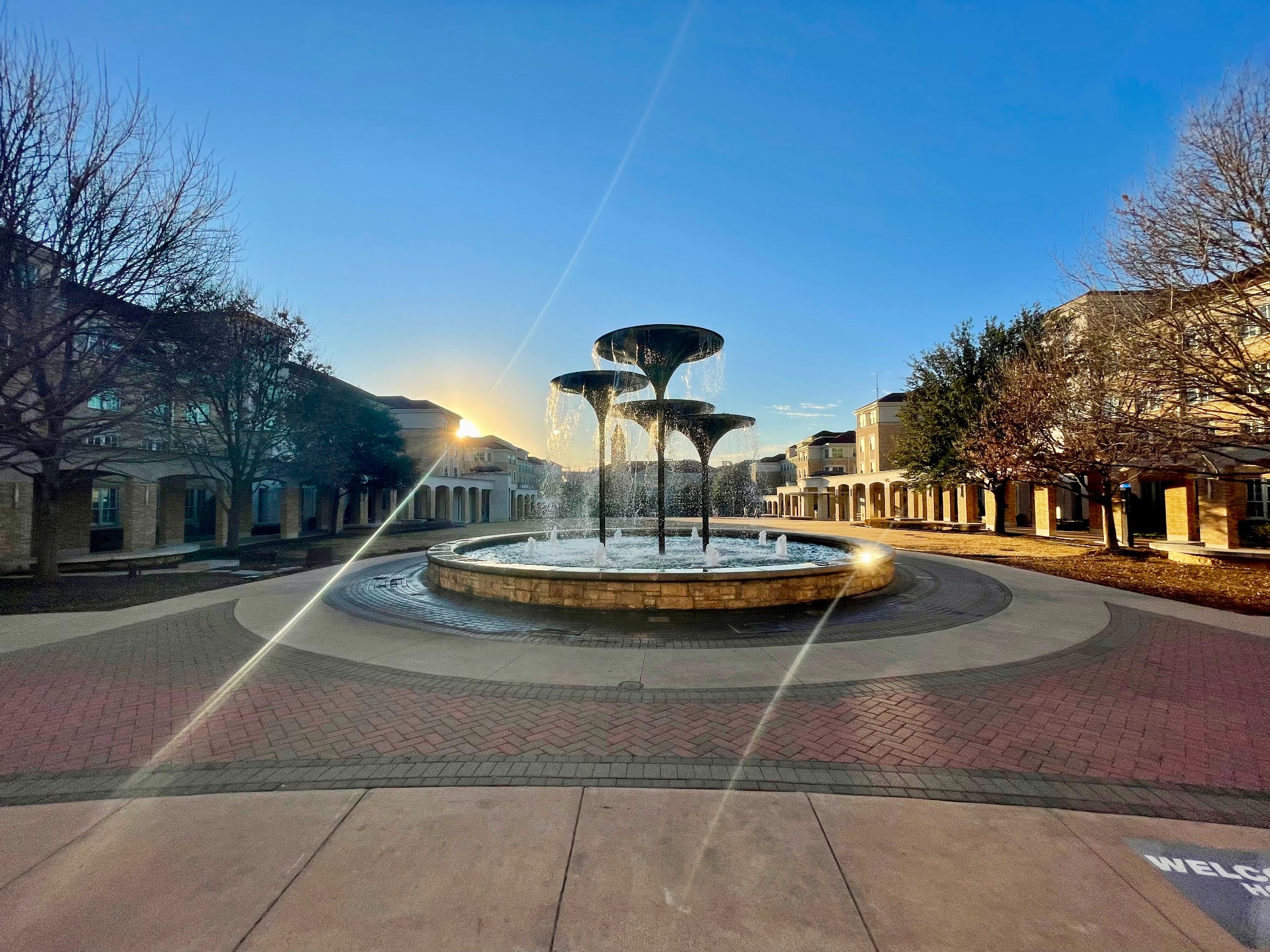 Sunbeams shimmer on Frog Fountain at TCU. (Ella M. Mercer)