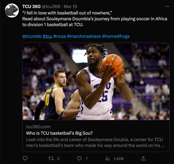 My reporting team built a social media presence for TCU 360 articles. Our assignments included campaigns on Instagram and Twitter, for which we contributed graphics and captions. I edited graphics on Canva, and my team came up with content and captions. We learned that an article will probably go lost in the mix without an abundance of social media engagement.